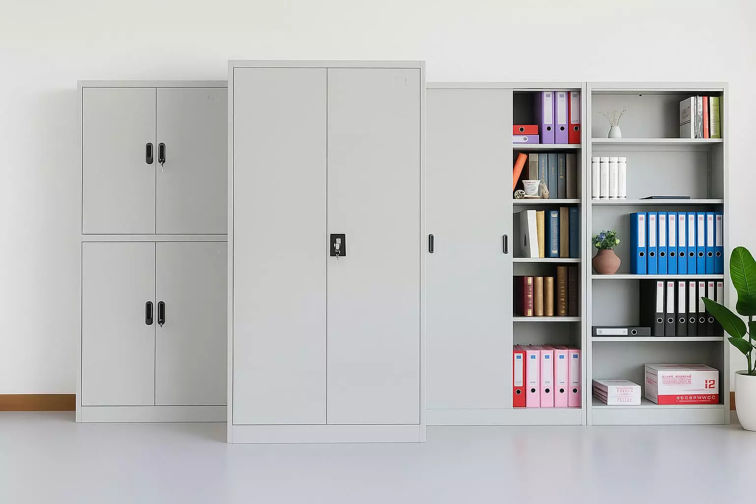 Стандартные металлические шкафы с распашными дверцами — классический вариант, который подходит для большинства задач. Обычно имеют несколько регулируемых по высоте полок. Замки обеспечивают базовый уровень безопасности.