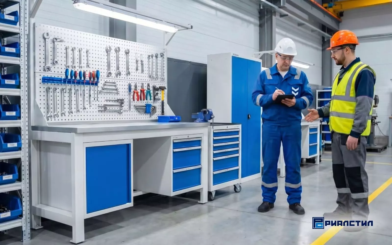 У верстаков «Риал Стил» сталь толщиной 0,7 мм — это на 20–30% прочнее аналогов (0,5 мм). Тиски закреплены штатными болтами. Инструмент — на перфопанелях или в выдвижных ящиках, каждому предмету — своё место по принципу системы 5S. Если задача — оснастить цех целиком, а не подбирать мебель поштучно, удобнее использовать комплексные рабочие места «С-Профиль»: верстак, перфопанель, освещение, полки и тумбы в единой конструкции. Конструкторский отдел адаптирует комплектацию под конкретное производство.