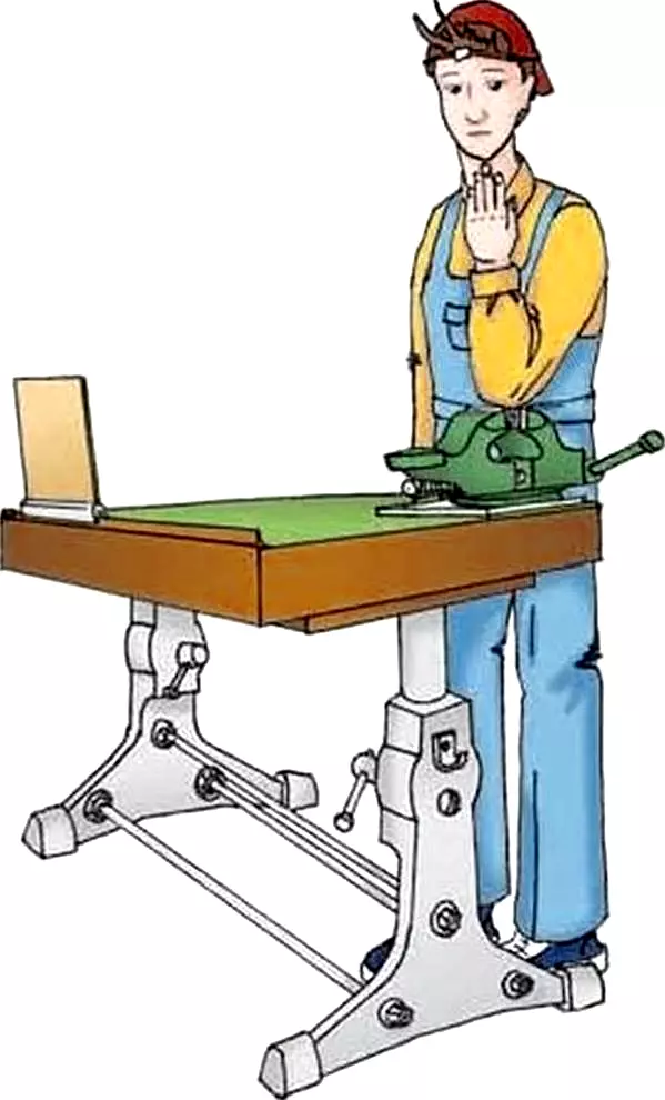 Лайфхак. Проверить высоту верстака на соответствие росту ученика просто. Учащийся встает перед верстаком и ставит локоть согнутой руки на губки тисков. Если высота подходит ученику, то кончики пальцев выпрямленной ладони должны касаться его подбородка. Посмотреть, как это выглядит, вы можете на этой картинке. Подростки легко справятся с этой задачей и смогут самостоятельно оценивать готовность рабочего стола перед началом урока.