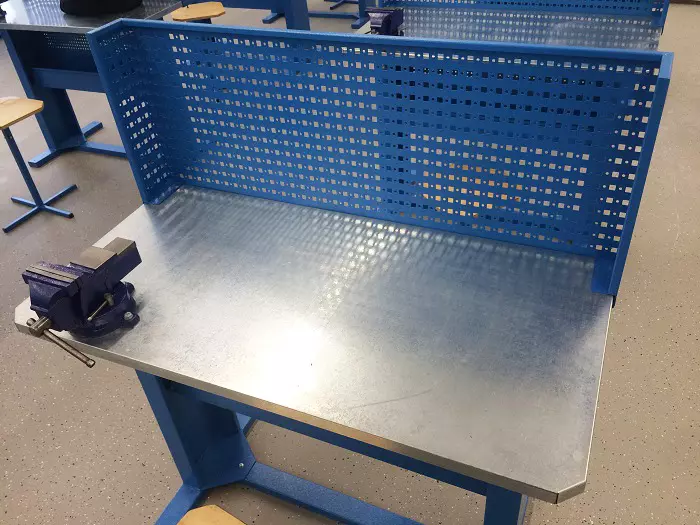К рабочей мебели из металла относятся верстаки и табуреты, которые используются при оснащении мастерских в школах, колледжах и вузах.