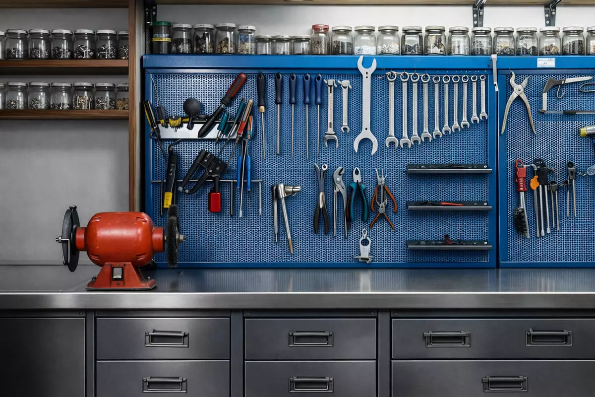 Разделите хранение на «ежедневное» и «редкое». Ежедневное — на панели и в верхних ящиках; редкое — на нижней полке или в тумбе. Так верстак не превращается в склад.