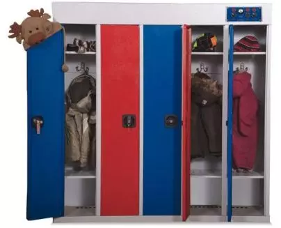 Этот шкаф предназначен для сушки детской одежды. Он имеет 5 независимых секций, что позволяет сушить вещи каждого ребенка отдельно.