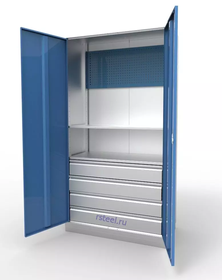 Цельносварной металлический шкаф КД-08-И с одной секцией, двумя дверьми, двумя полками, четырьмя выдвижными ящиками и малым перфорированным экраном предназначен для хранения инструмента и оснастки в производственных цехах, мастерских, гаражах и других помещениях. Это идеальное решение для хранения инструмента и организации вашего рабочего пространства. Изготовленный из высококачественной листовой стали толщиной 0,7 мм, он обладает прочной и долговечной конструкцией.