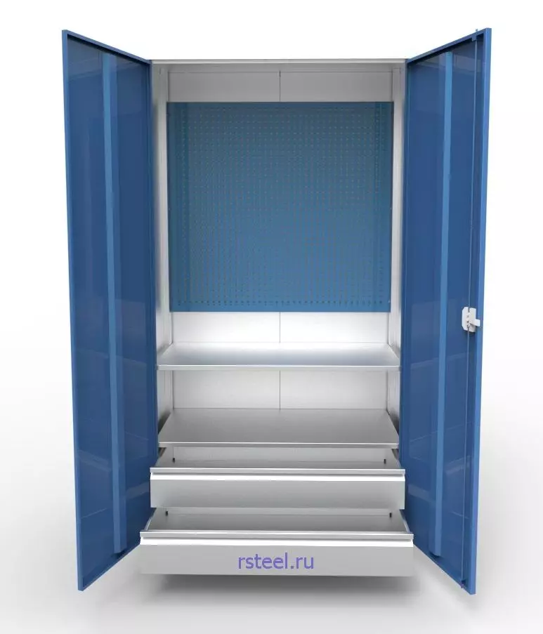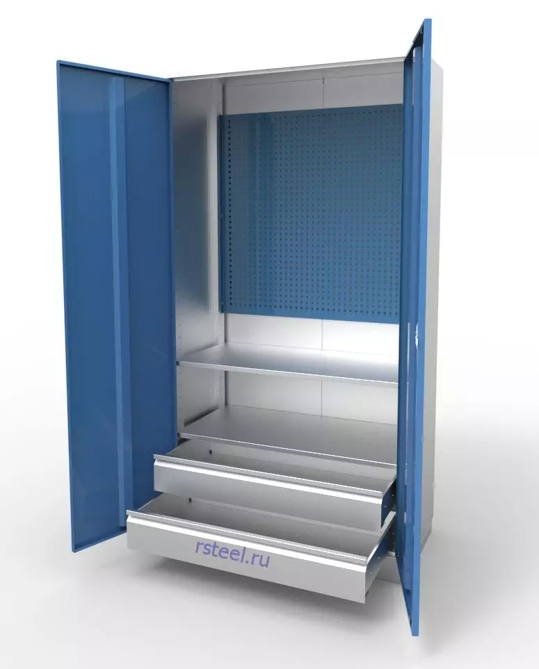 Цельносварной металлический шкаф КД-02-И с одной секцией, двумя дверьми, двумя полками, двумя выдвижными ящиками и большим перфорированным экраном предназначен для хранения инструмента и оснастки в производственных цехах, мастерских, гаражах и других помещениях. Это идеальное решение для хранения инструмента и организации вашего рабочего пространства. Изготовленный из высококачественной листовой стали толщиной 0,7 мм, он обладает прочной и долговечной конструкцией.