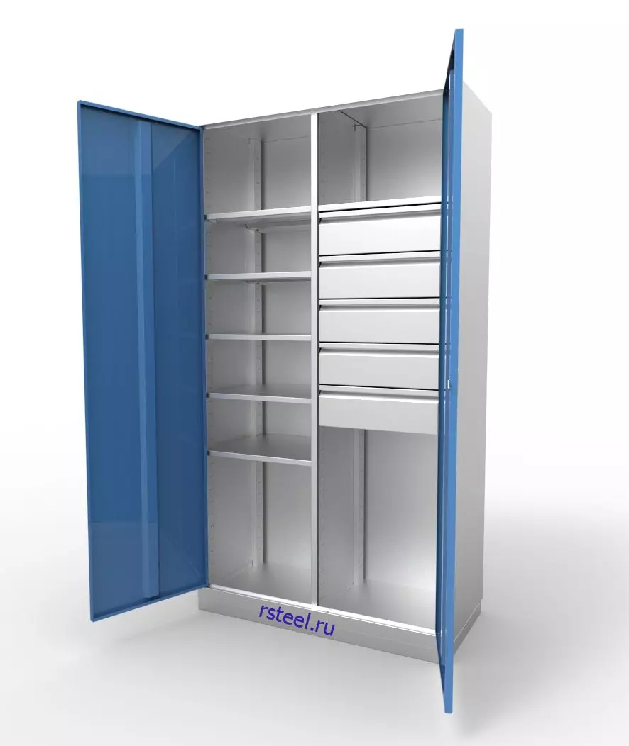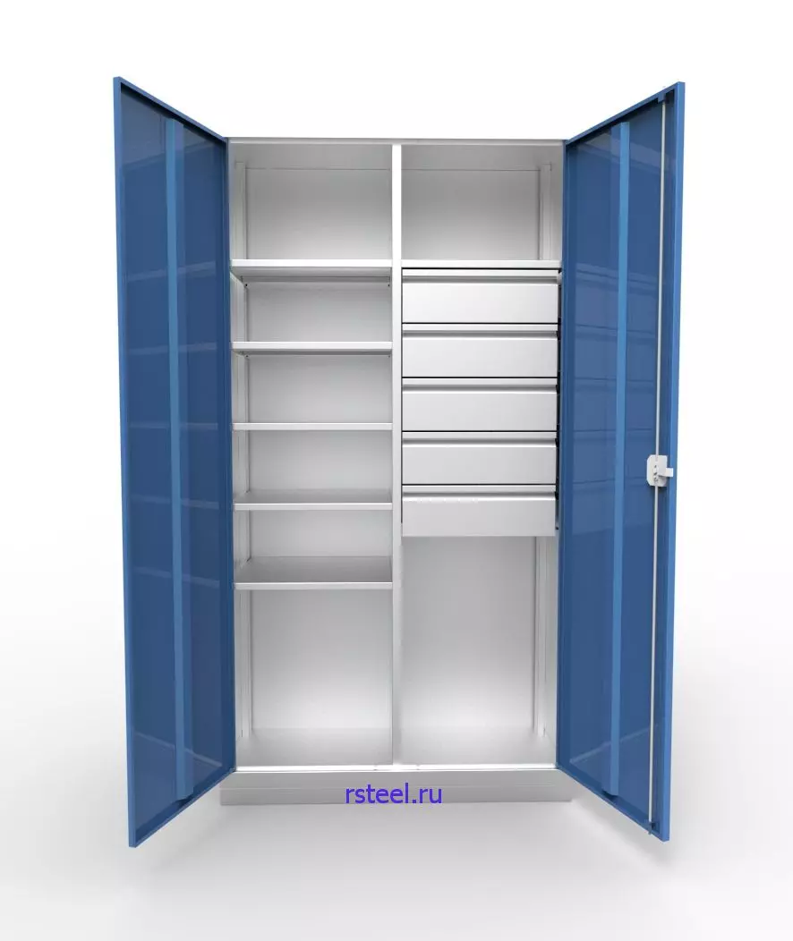 Цельносварной металлический шкаф КД-2.06.05 с двумя секциями, двумя дверьми, пятью ящиками и шестью полками предназначен для хранения инструмента и оснастки в производственных цехах, мастерских, гаражах и других помещениях. Это идеальное решение для хранения инструмента и организации вашего рабочего пространства. Изготовленный из высококачественной листовой стали толщиной 0,7 мм, он обладает прочной и долговечной конструкцией.
