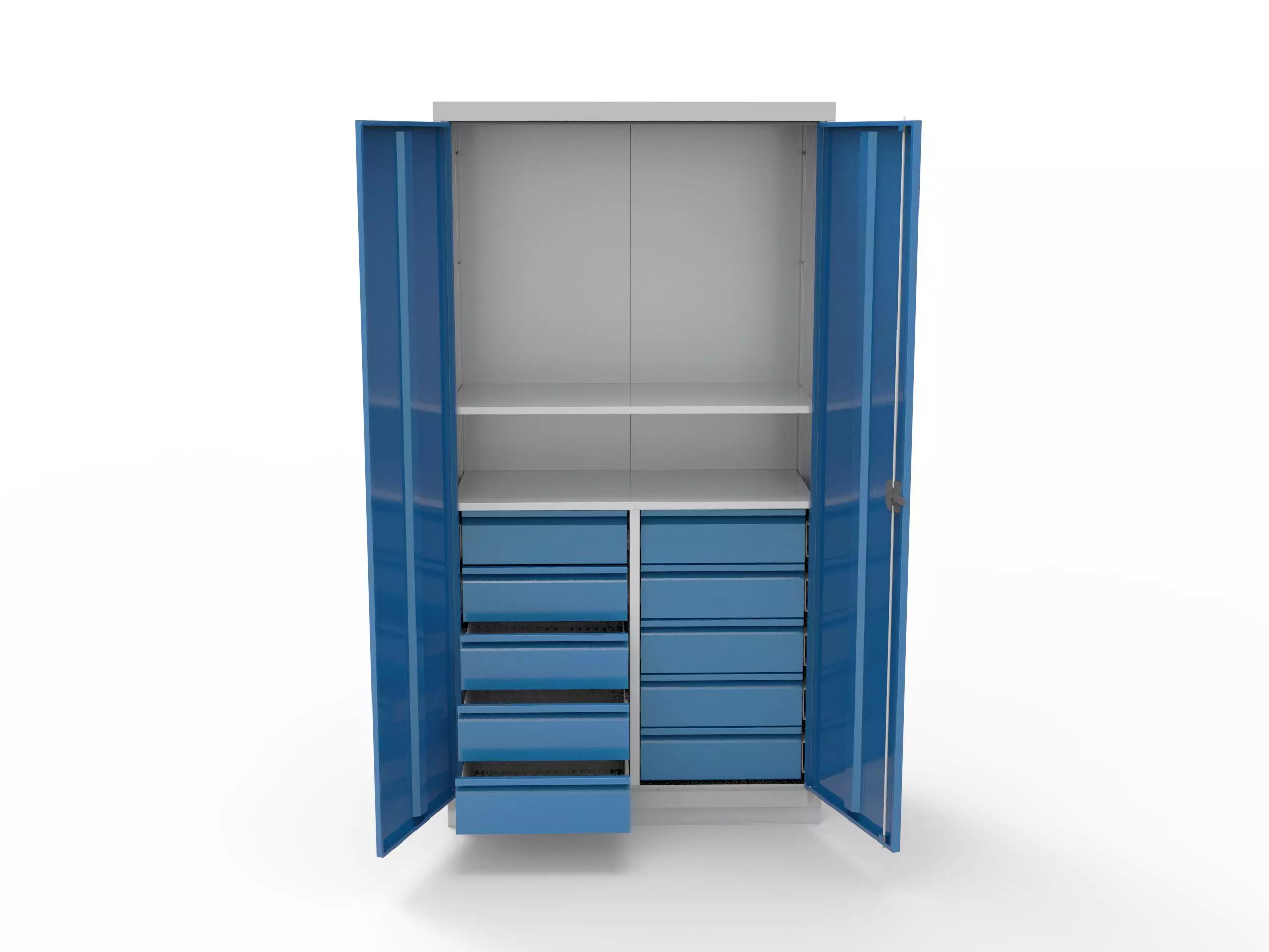 Цельносварной металлический шкаф КД-3.01.10 с двумя секциями, двумя дверьми, десятью ящиками и двумя полками предназначен для хранения инструмента и оснастки в производственных цехах, мастерских, гаражах и других помещениях. Это идеальное решение для хранения инструмента и организации вашего рабочего пространства. Изготовленный из высококачественной листовой стали толщиной 0,7 мм, он обладает прочной и долговечной конструкцией.