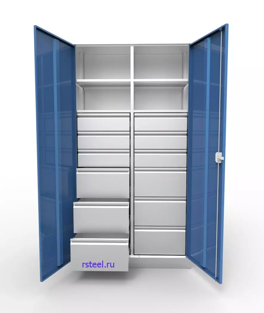 Цельносварной металлический шкаф-тумба КД-2.04.12 с двумя секциями, двумя дверьми, четырьмя полками и двенадцатью выдвижными ящиками двух типов предназначен для хранения инструмента и оснастки в производственных цехах, мастерских, гаражах и других помещениях. Это идеальное решение для хранения инструмента и организации вашего рабочего пространства. Изготовленный из высококачественной листовой стали толщиной 0,7 мм, он обладает прочной и долговечной конструкцией.