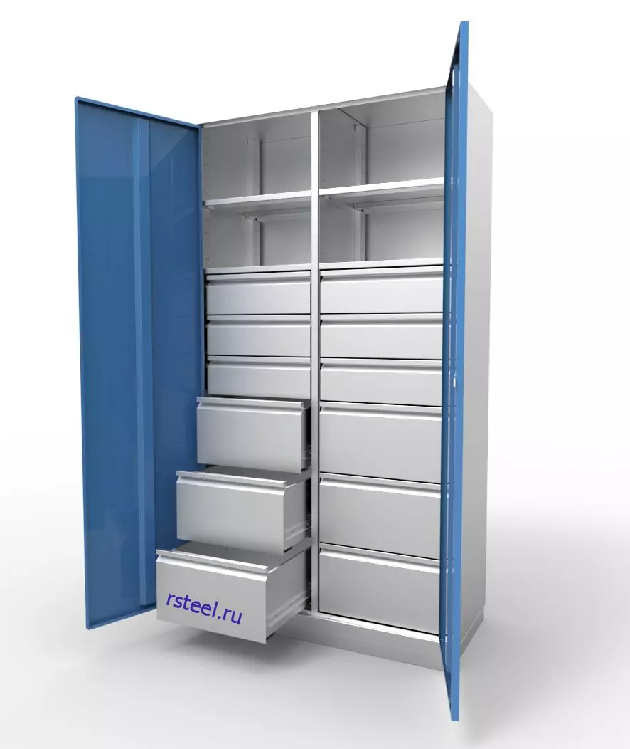 2 секции, 4 полки, по 3 средних и по 3 больших ящика в каждой секции, замок "Euro Lock"(Германия) с надежной ригельной системой запирания (тяги "вверх-вниз"). |