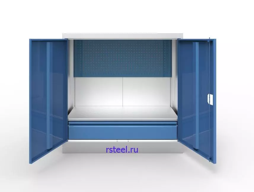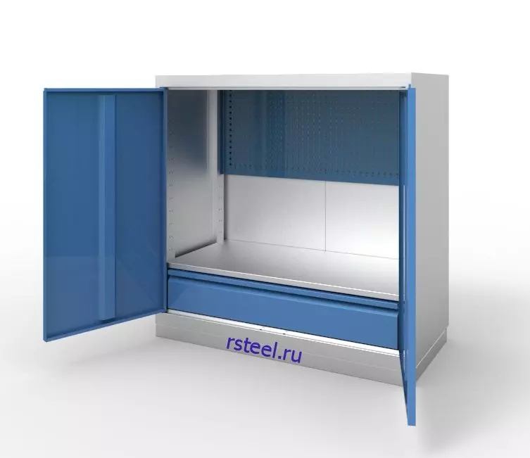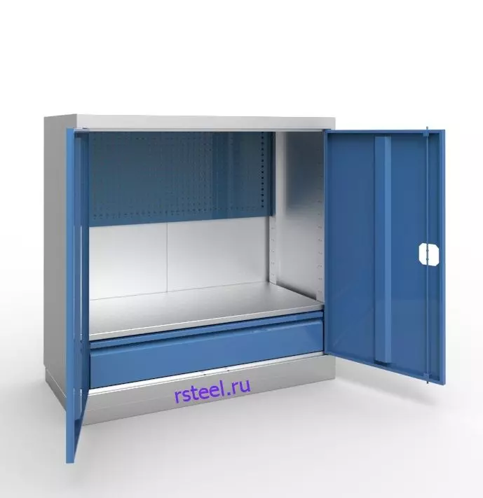 Цельносварной металлический шкаф-тумба КДт-1.01.01.Эм с одной секцией, двумя дверьми, одной полкой, одним выдвижным ящиком и малым перфорированным экраном предназначен для хранения инструмента и оснастки в производственных цехах, мастерских, гаражах и других помещениях. Это идеальное решение для хранения инструмента и организации вашего рабочего пространства. Изготовленный из высококачественной листовой стали толщиной 0,7 мм, он обладает прочной и долговечной конструкцией.