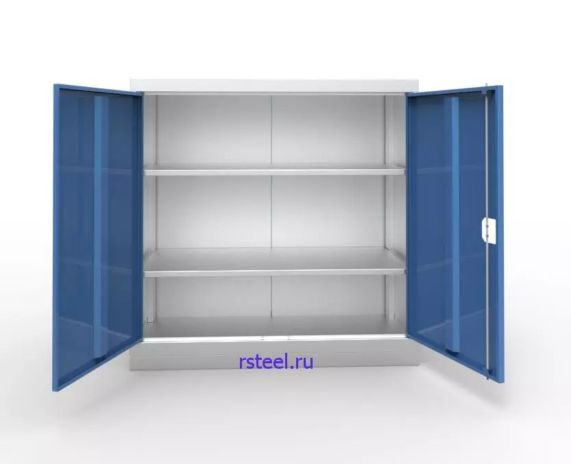 Две распашные двери шкафа усилены двумя ребрами жесткости. Защиту от несанкционированного доступа обеспечивает ригельный замок с трехсторонним закрыванием.