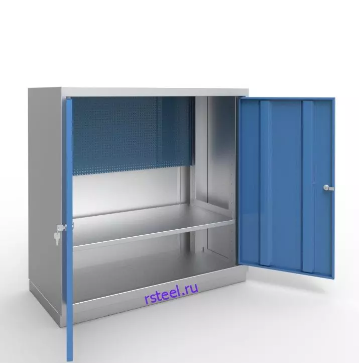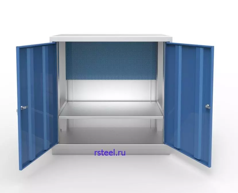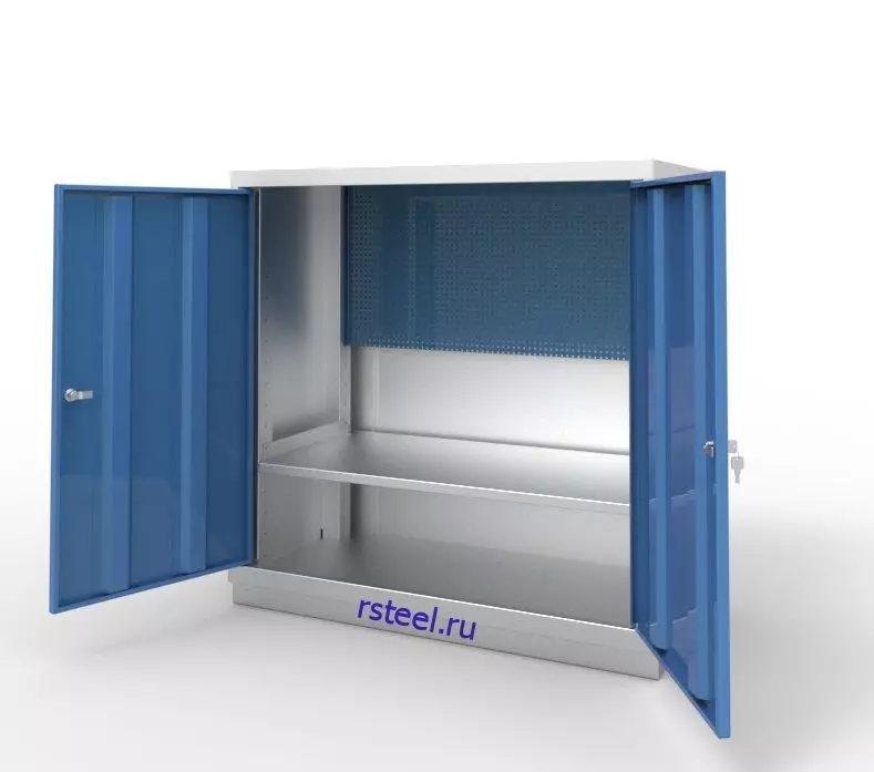 Две распашные двери шкафа усилены двумя ребрами жесткости. Защиту от несанкционированного доступа обеспечивают два ригельных замка.