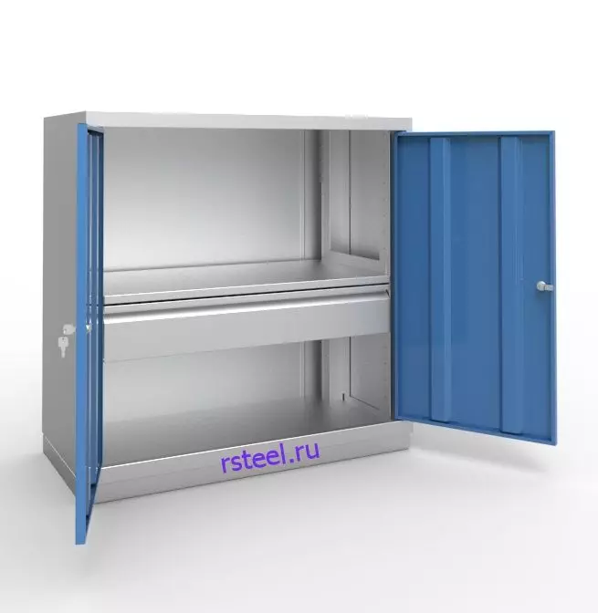 Цельносварной металлический шкаф-тумба КДт-1.01.01 с одной секцией, двумя дверьми, одной полкой и одним выдвижным ящиком предназначен для хранения инструмента и оснастки в производственных цехах, мастерских, гаражах и других помещениях. Это идеальное решение для хранения инструмента и организации вашего рабочего пространства. Изготовленный из высококачественной листовой стали толщиной 0,7 мм, он обладает прочной и долговечной конструкцией.