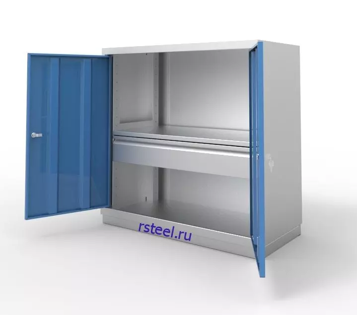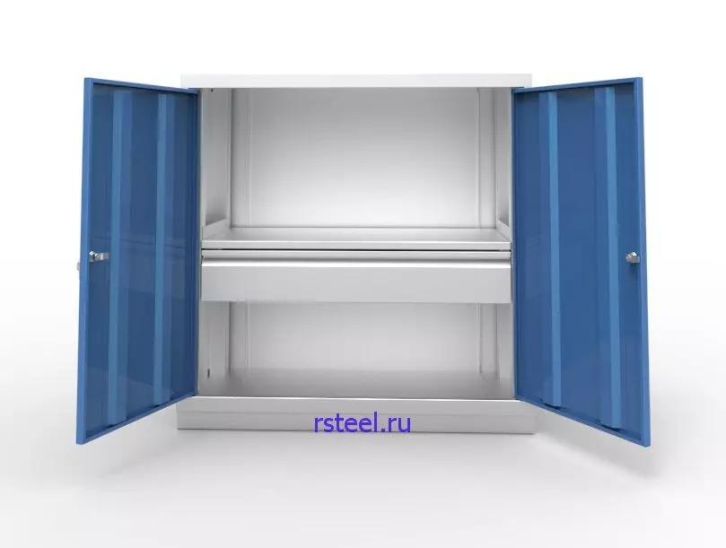 Две распашные двери шкафа усилены ребром жесткости. Надежную защиту от несанкционированного доступа обеспечивает ригельный замок с трехсторонним запиранием.
