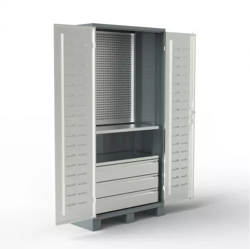 1 секция, 1 ригельный замок-ручка, 2 съемные полки, 3 ящика, 1 перфопанель для держателей и крючков |
