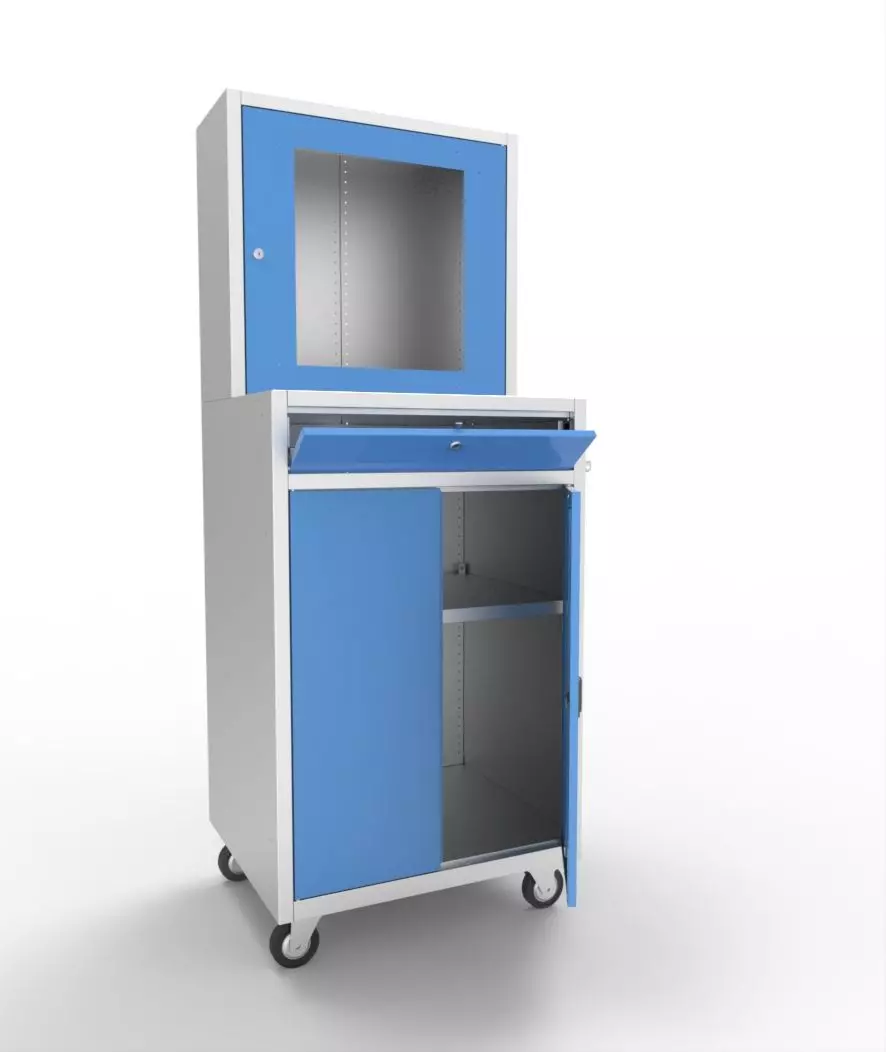 - Стальные части шкафа имеют эпоксидно-порошковое покрытие, корпус и двери – светло-серый (RAL 7035), возможна покраска ящика и дверей в синий (RAL 5015).