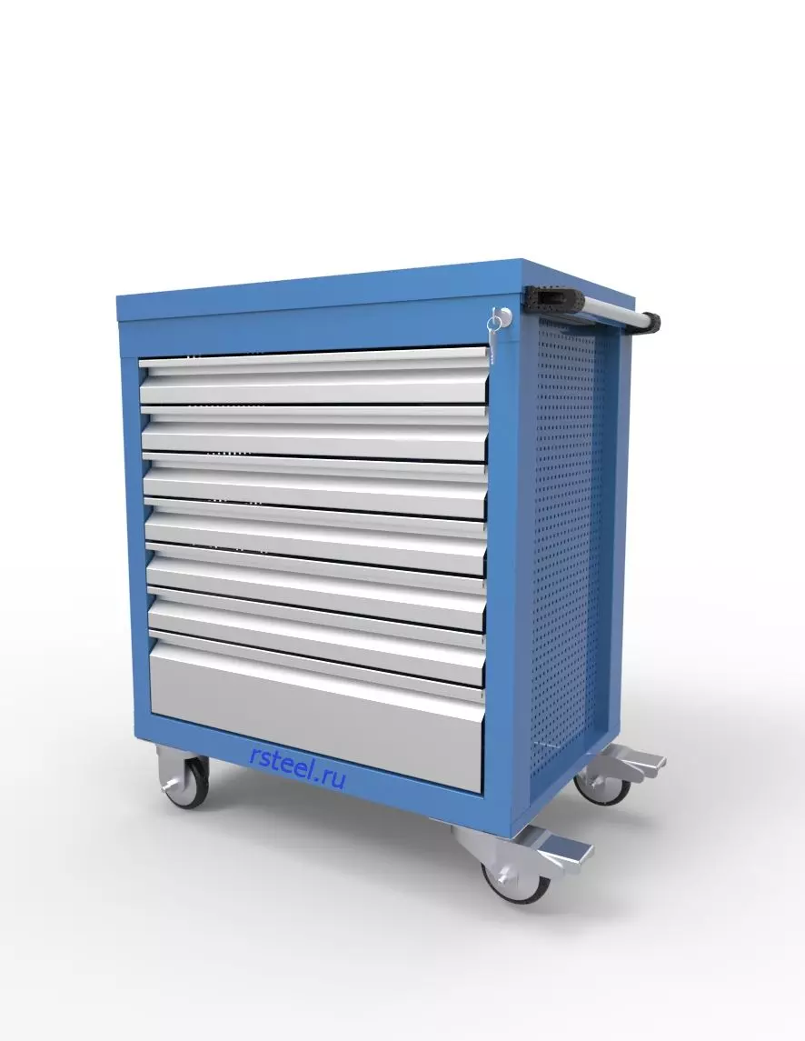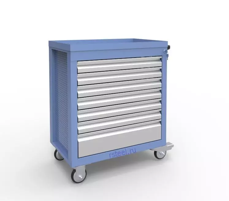 8 ковриков полиуретановых; на крышке бортик по 4м сторонам для сохранности инструмента; 4 колеса d100 мм (2 поворотных с тормозом + 2 не поворотных); 2 боковые панели с перфорацией для крепления держателей инструмента и полок; сбоку ручка для перемещения. |