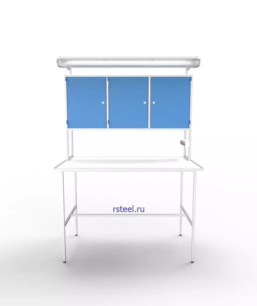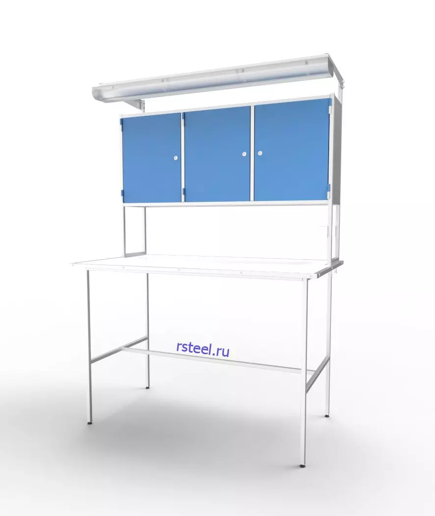 - съемный верхний экран с навесным шкафчиком с 3 полками, 3 распашными металлическими дверцами и замками, а также оснащен 1 светильником;