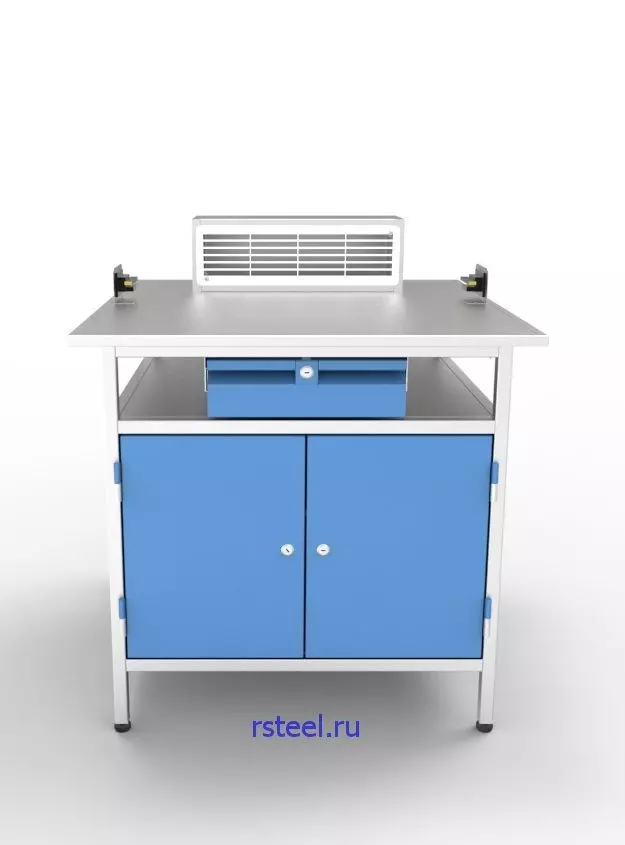 - столешница из нержавеющей стали с деревянной подложкой; столешница оснащена двумя клеммниками для зарядки аккумуляторов и вытяжным зонтом с вентиляционной решеткой,
