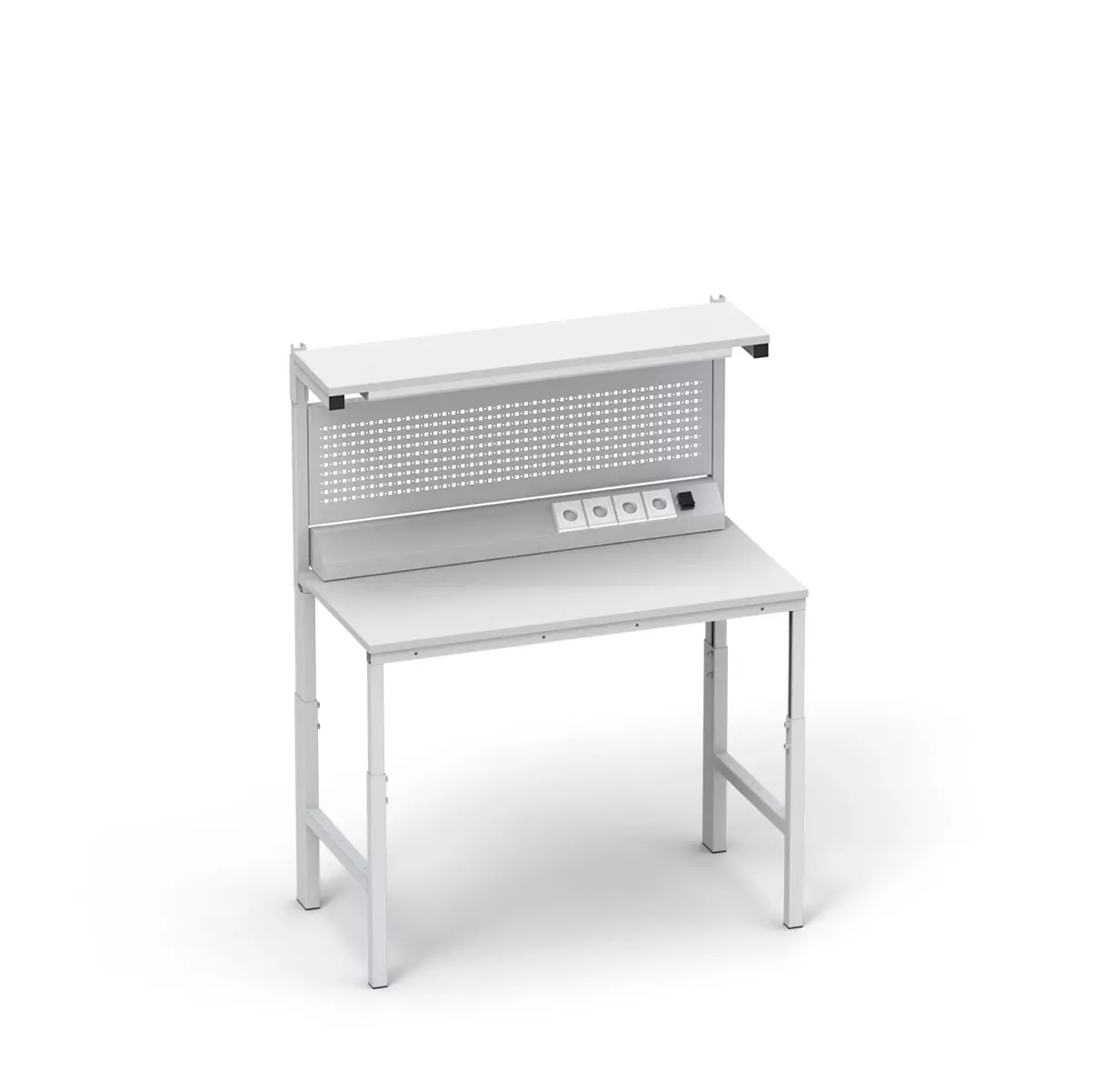 Стол укомплектован одной полкой, расположенной над столешницей, по всей ее ширине. Полка способна выдерживать до 30 кг нагрузок. Расположение полки свободно регулируется по всей высоте стоек.