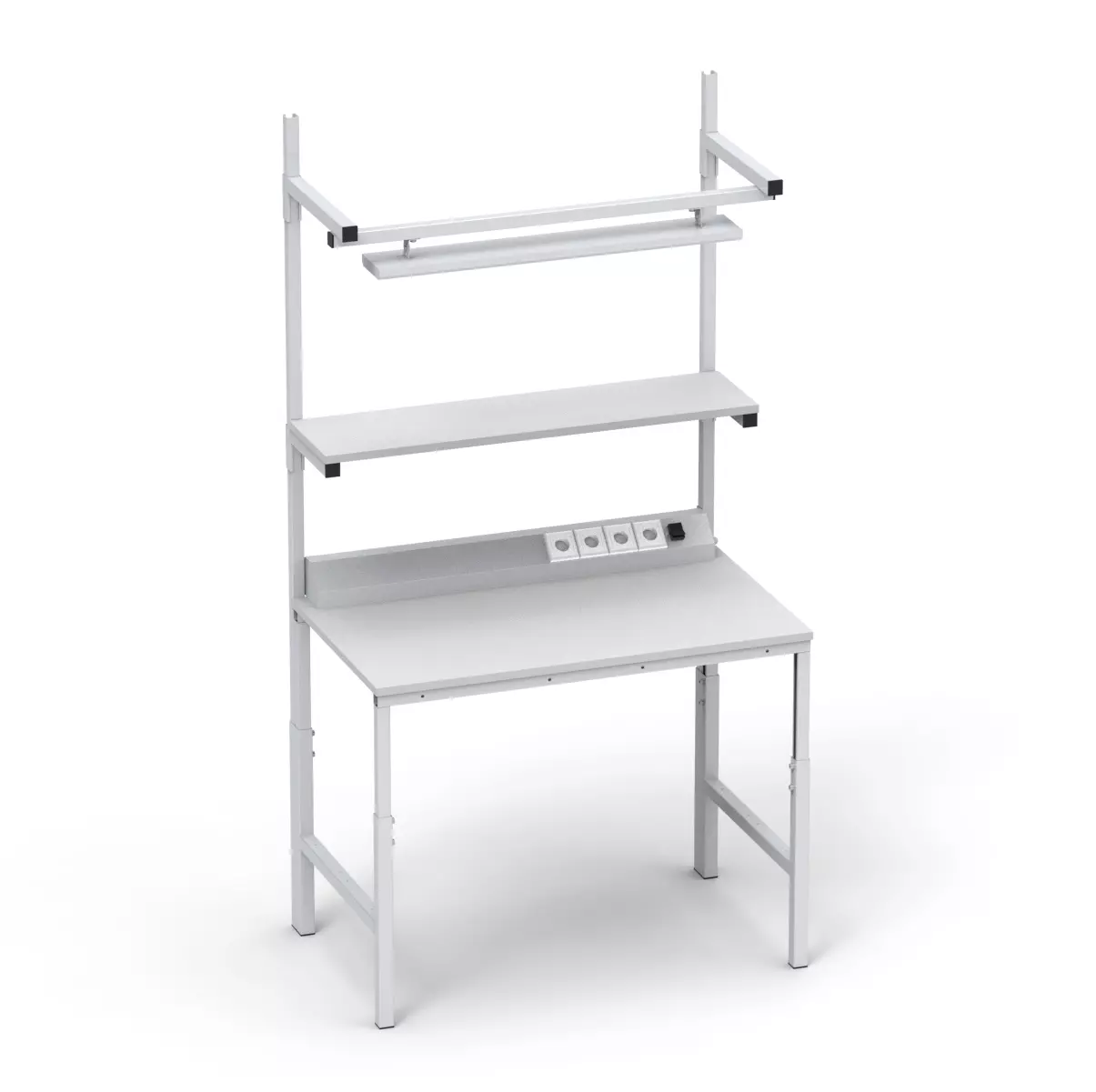 Стол укомплектован одной полкой, расположенной над столешницей, по всей ее ширине. Полка способна выдерживать до 30 кг нагрузок. Расположение полки свободно регулируется по всей высоте стоек.