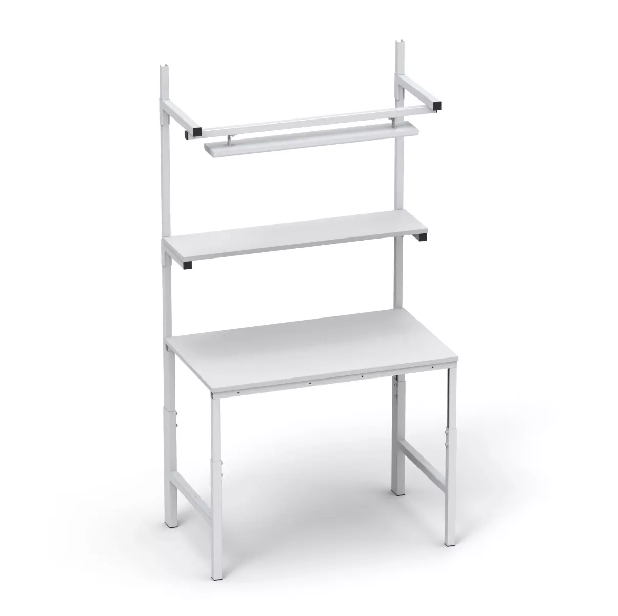 Стол может быть укомплектован одной или двумя полками, расположенными над столешницей, по всей ее ширине. Полка способна выдерживать до 30 кг нагрузок. Расположение полки свободно регулируется по всей высоте стоек.