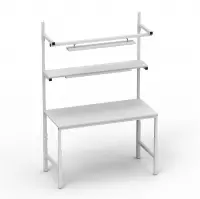 Стол укомплектован одной полкой, расположенной над столешницей, по всей ее ширине. Полка способна выдерживать до 30 кг нагрузок. Расположение полки свободно регулируется по всей высоте стоек.