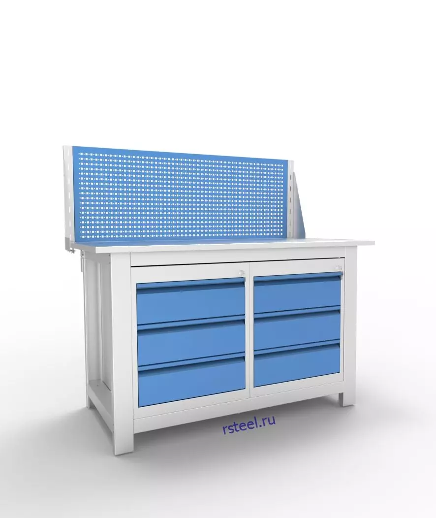 Усиленный слесарный верстак предназначен для профессионального обустройства рабочих мест в цехах заводов и промышленных предприятий. За счет крепкой конструкции из сварных тумб и стальных опор, изделие выдерживает равномерно распределенную нагрузку от 1 500 кг до 3 000 кг (итоговые нагрузочные характеристики изделия зависят от выбранного типа столешницы).