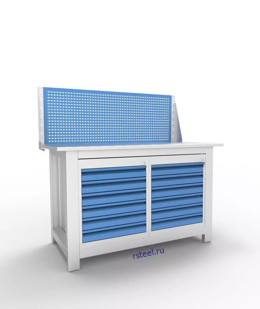 Усиленный слесарный верстак предназначен для профессионального обустройства рабочих мест в цехах заводов и промышленных предприятий. За счет крепкой конструкции из сварных тумб и стальных опор, изделие выдерживает равномерно распределенную нагрузку от 1 500 кг до 3 000 кг (итоговые нагрузочные характеристики изделия зависят от выбранного типа столешницы).