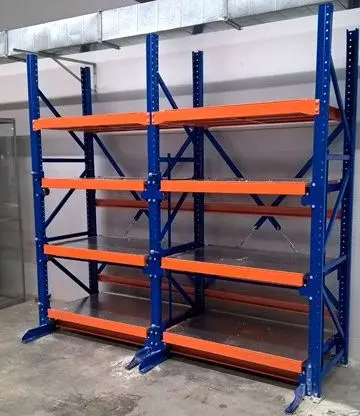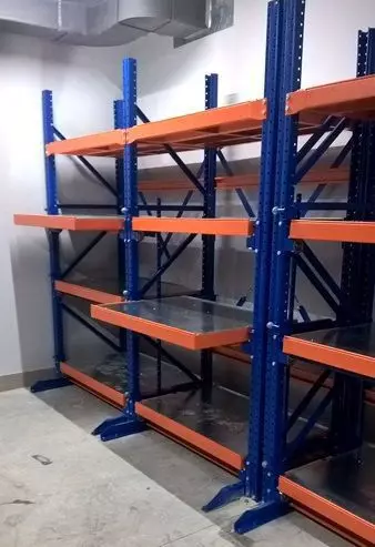 — 15 усиленных стеллажей с выкатными платформами для хранения штампов;