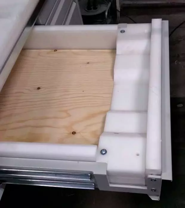 Нижняя часть обода закреплялась на выдвинутом ящике. Внутри ящика мы установили полипропиленовую подставку, выемки на которой полностью соответствовали форме обода и позволяли установить его максимально надежно. Закрытие и открытие ящика контролировалось с помощью рычага, который при необходимости фиксировал ящик в выдвинутом положении.