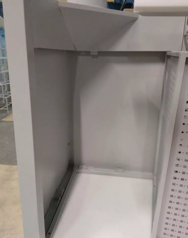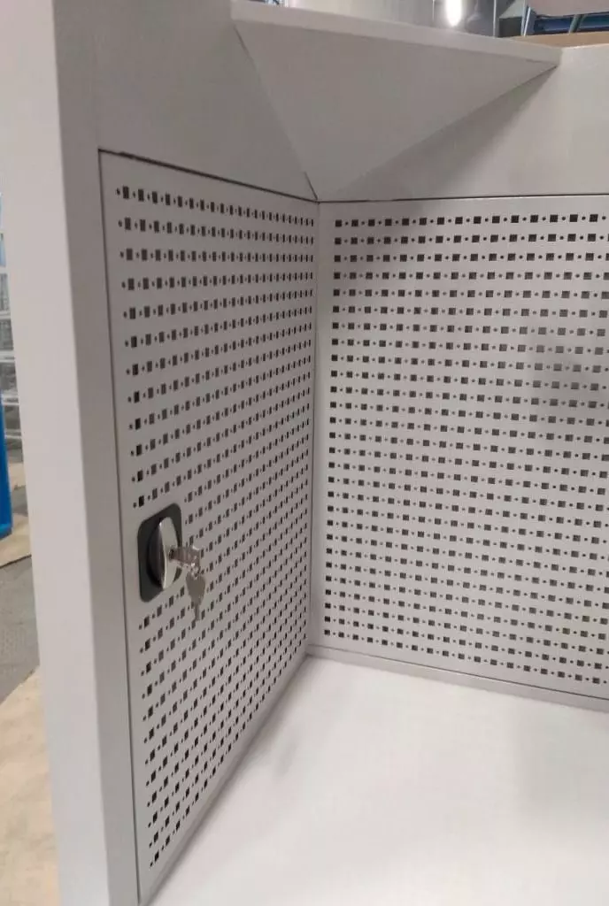- Освободили рабочую поверхность от проводов с помощью специального тайника, который разместили в угловой части перфорированного экрана.
